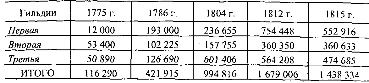 Постепенно правительство ввело ряд других изменений в законодательство о российском купечестве. Манифест 1807 года поднял планку для первой гильдии до 50 тысяч рублей капитала, у второй она достигла 20 тысяч рублей и у третьей — доведена до 8 тыс. руб. Вот каким образом с годами в России менялись размеры объявленного капитала для вхождения купца в ту или иную гильдию и размеры платы с него в казну40: