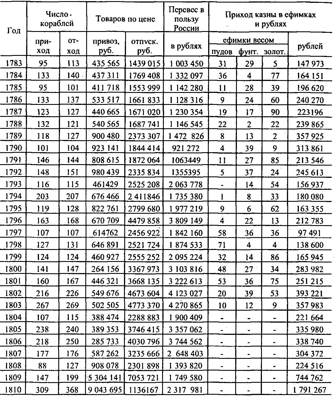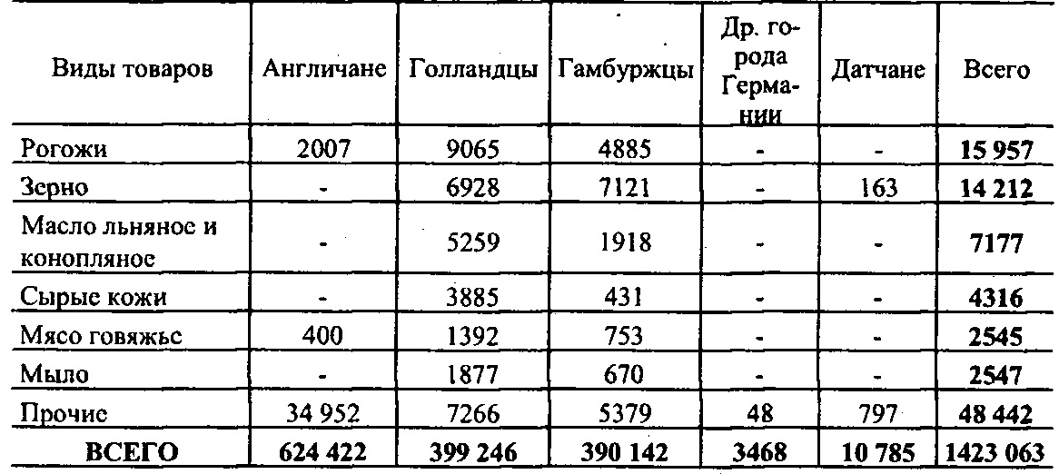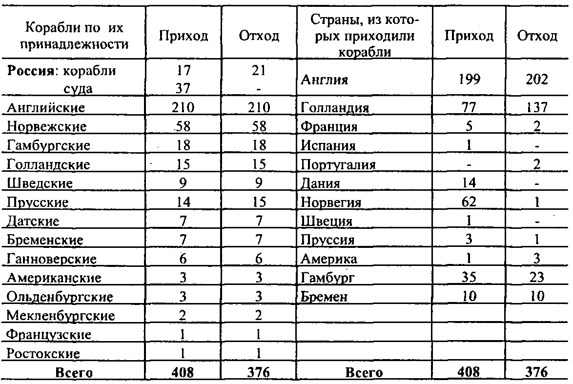 В числе кораблей, пришедших в Архангельск, были: 5 — с товаром, 29 — стоваром и балластом, 37 — с рыбой, выменянной на хлеб, 2 — с углем, 334 — с балластом, 1 — без товара и без балласта. Источник: ГААО. Ф. 2. On. 1. Д. 844. Л. 185 об.