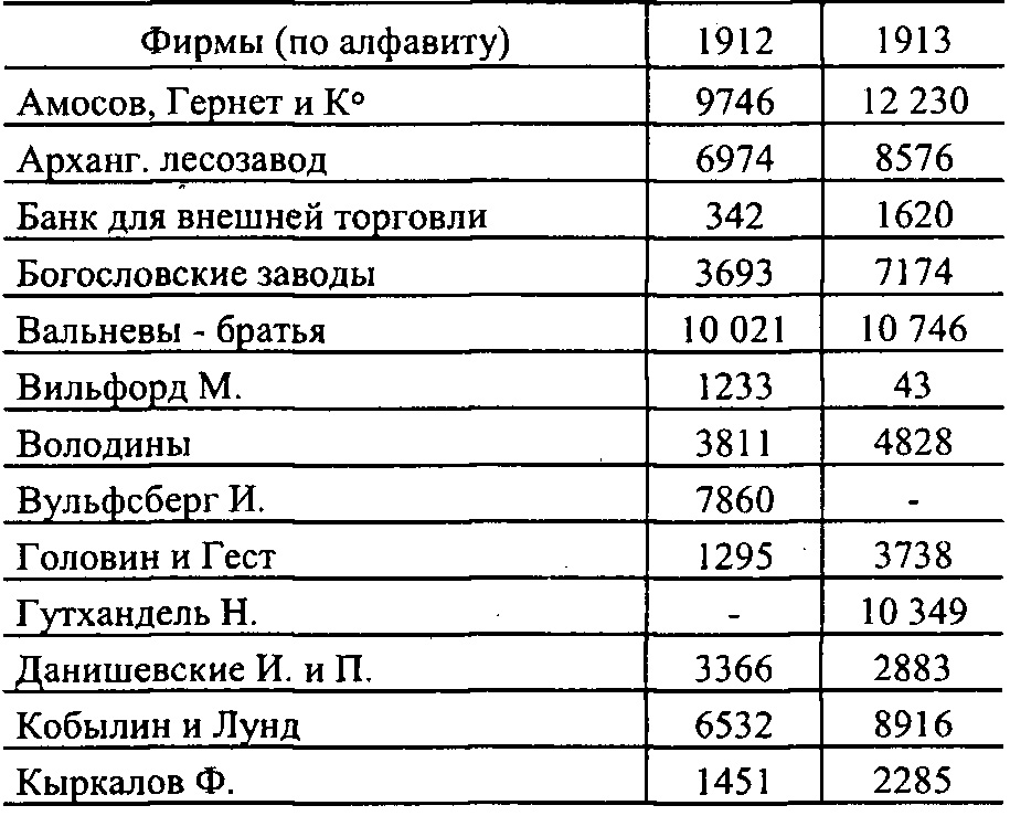 Вывоз леса из Архангельска отдельными фирмами в 1912—1913 гг. (указаны фирмы, вывезшие свыше 1000 стд.)