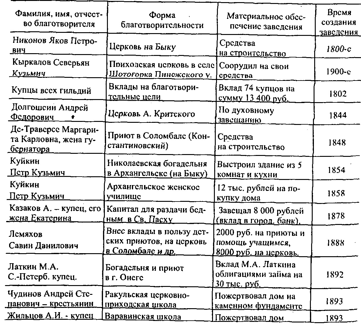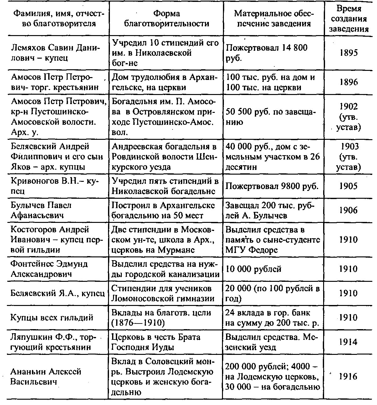 Источники: Устав богадельни им. П.П. Амосова… Арх.-ск. 1902; Устав Андреевской богадельни в деревне Левковской Ровдинской волости Шенкурского уезда. Арх-ск. 1903; Отчет о приходе, расходе и остатке денежных средств по содержанию богадельни и приюта им. СПб. купца М.А. Латкина в г. Онеге. Арх-ск. 1895; Справочная книга по Архангельскому городскому общ. управлению. 1870—1910. Архангельск. 1910. С. 270—276; Памятная книжка Арх. губ. на 1909. С. 46—47; Новиков А.В. Лешуконье. Архангельск. 1999. С. 65; АГВ. 1861. 4 февраля и данные ГААО. (Сведения выборочные, на учет взяты наиболее крупные вклады).
