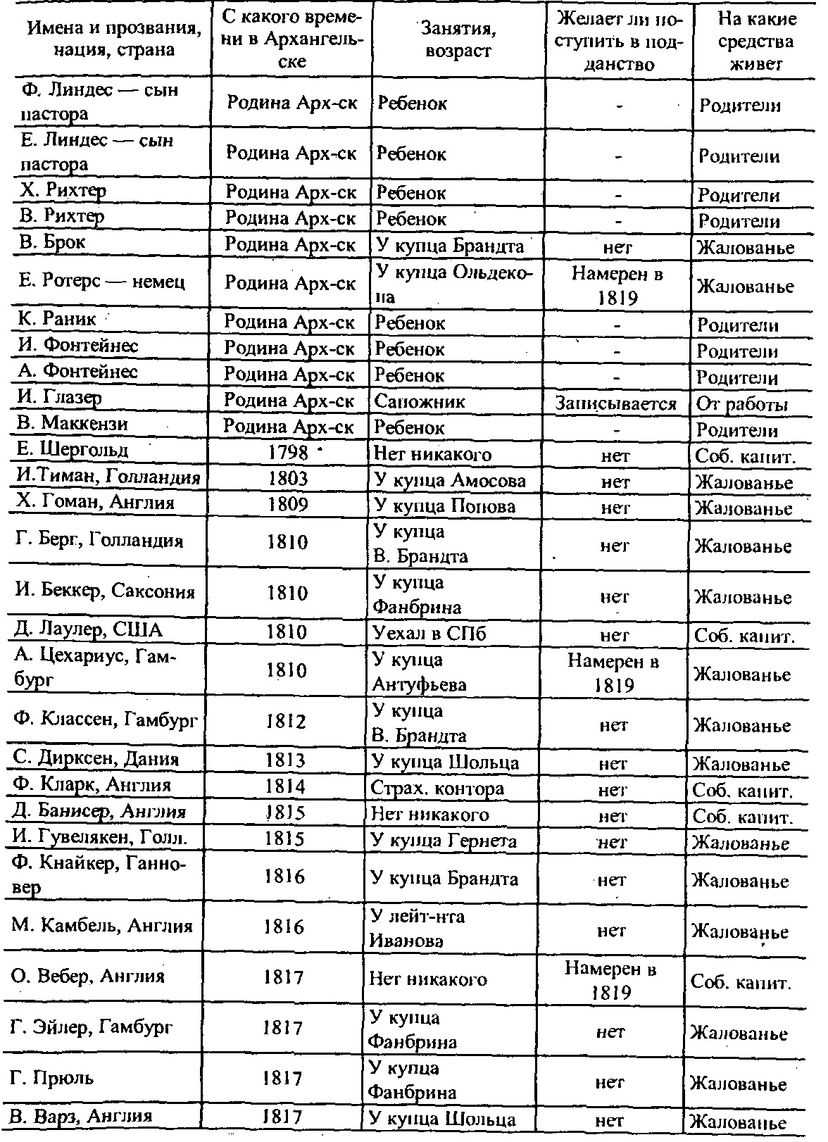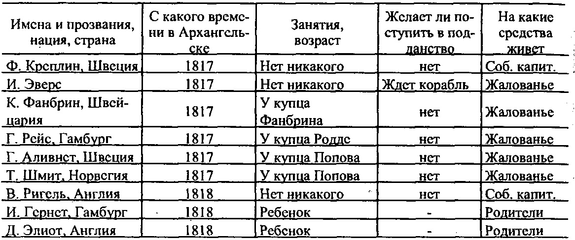 Список иностранцев, проживавших в городе Архангельске и Соломбальской части (1818 год)