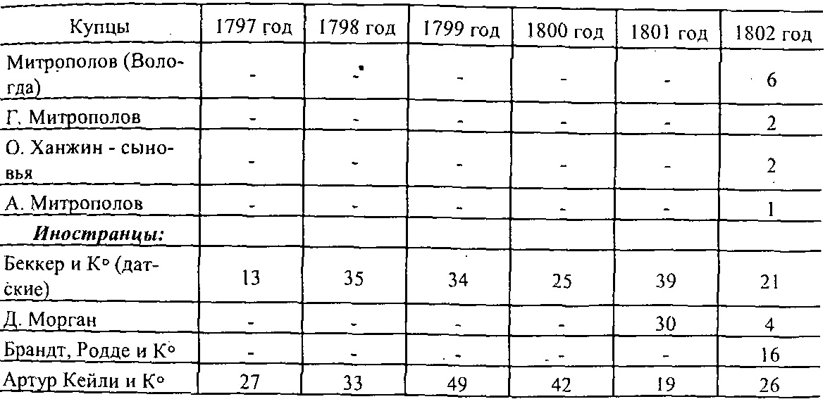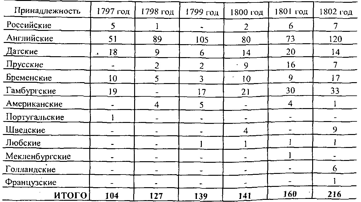 Количество кораблей, пришедших в Архангельск к русским и иностранным купцам (1797—1802 гг.)