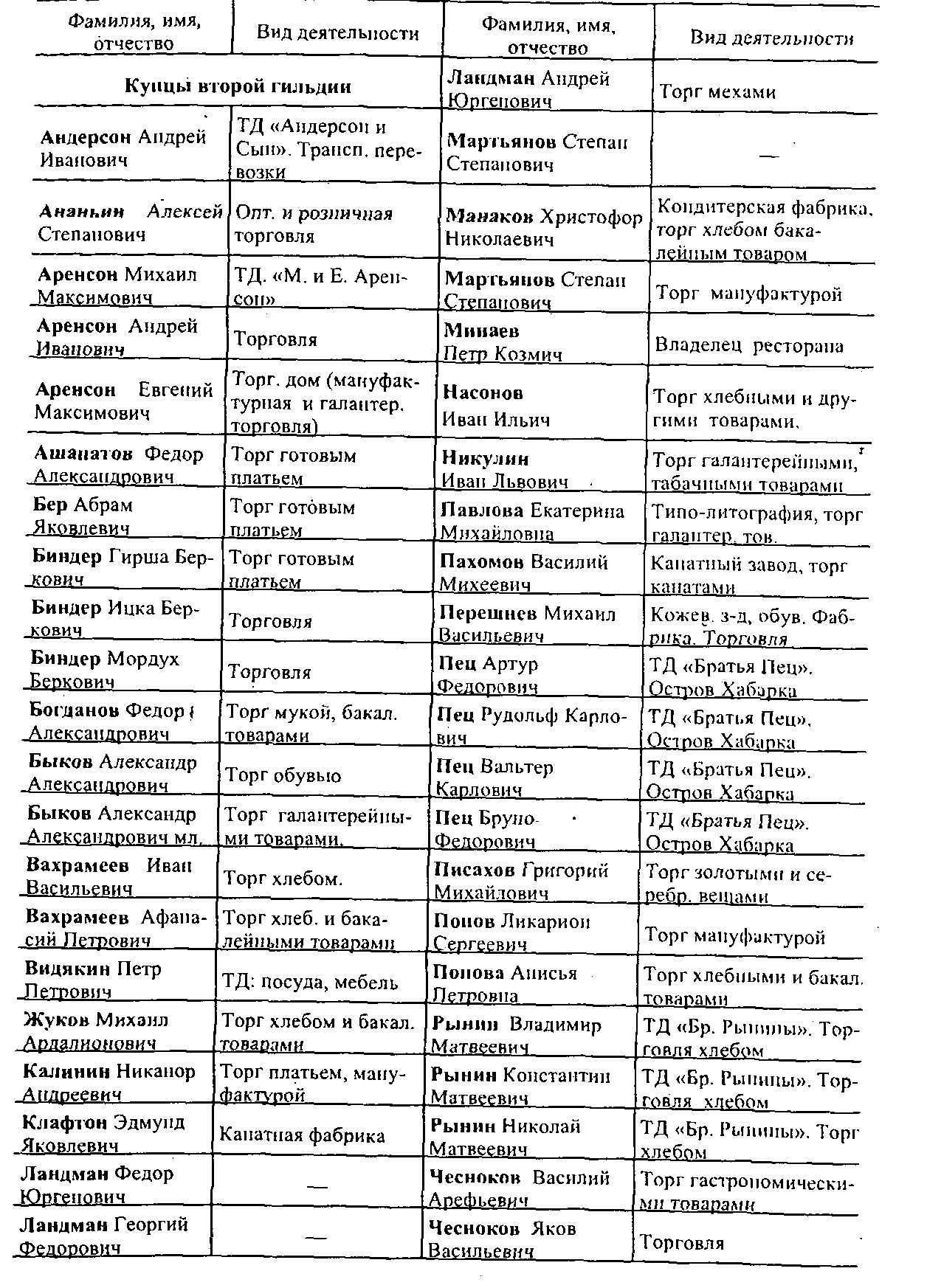 В состав первой гильдии вошли «банкиры, знатные купцы, которые имеют отъезжие большие торги и которые разными многими товарами в рядах торгуют, городские докторы, аптекари и лекари, шкиперы купеческих кораблей, золотари, серебренники, иконники, живописцы».